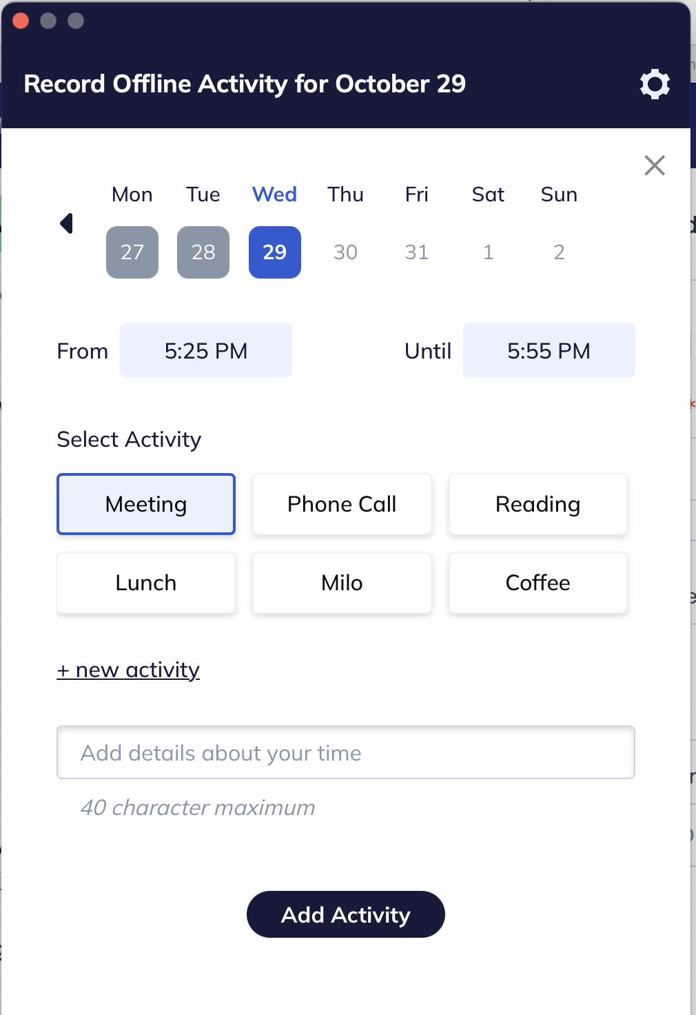 You can add offline work, work done away from your computer, to count toward your Focus Work, Other Work, or Meetings. Just fill out a simple form and you're on your way to making all your work time count.