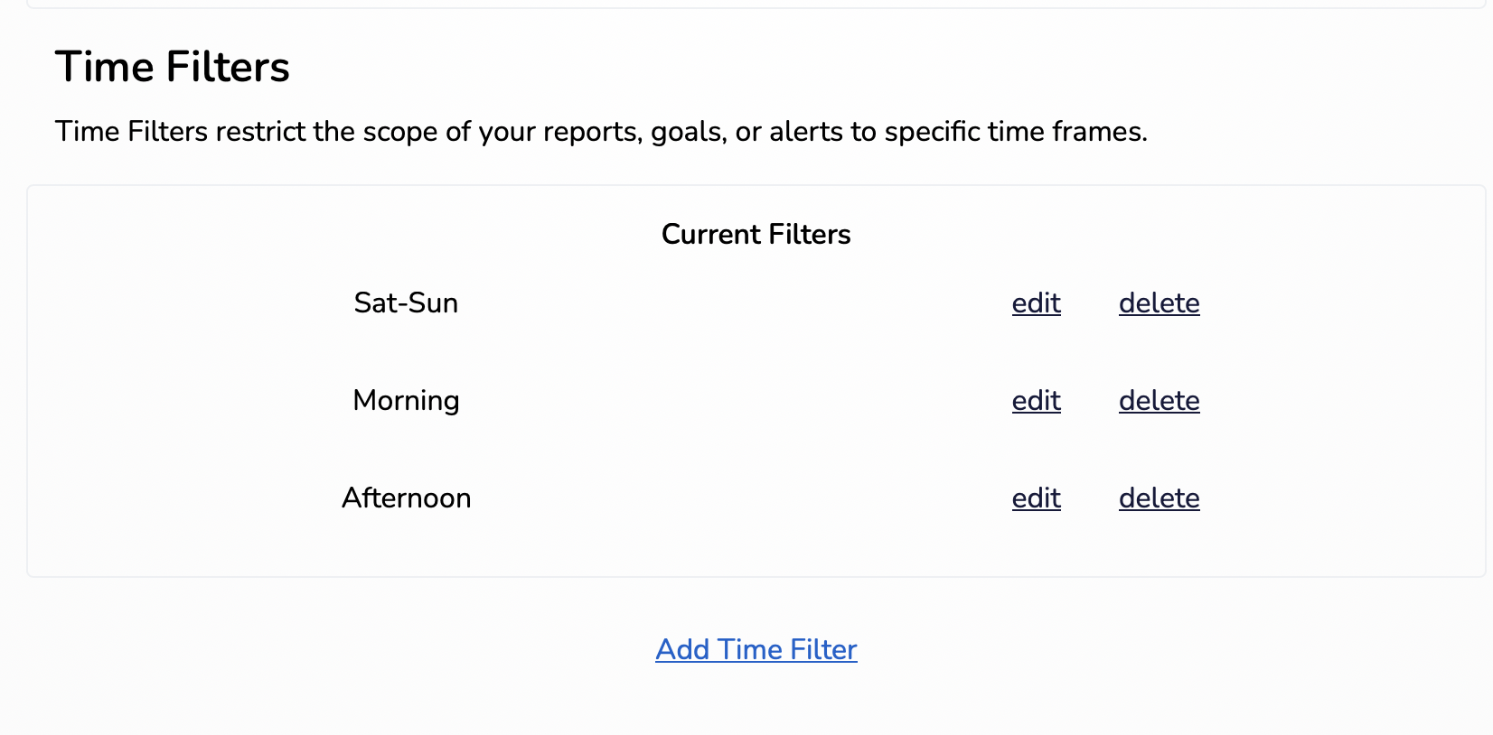 Premium accounts can create time filters to screen your data by time period and to set custom ranges for goals and alerts.