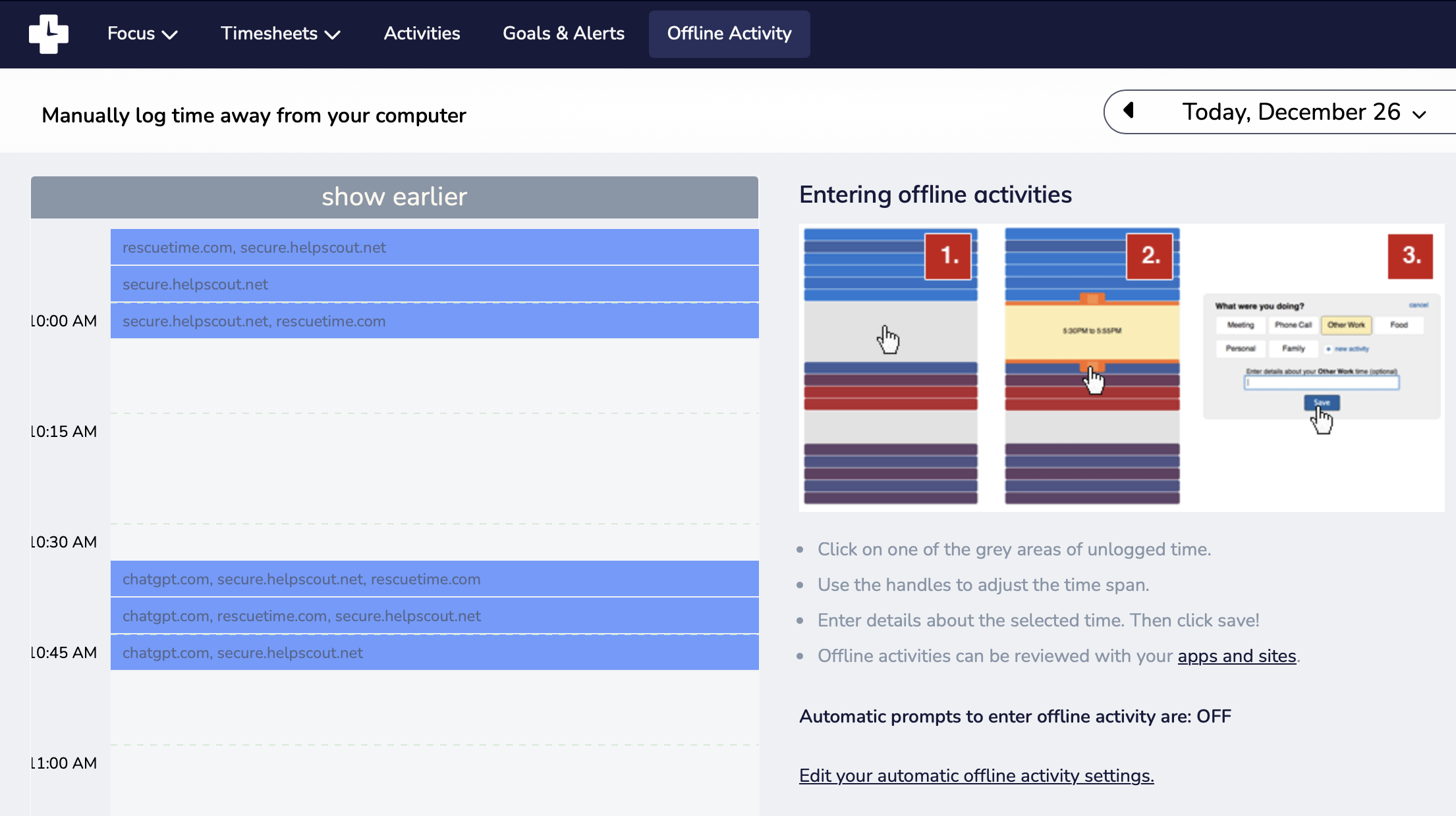 Premium accounts may enter details for offline activities manually on the RescueTime website or through the Offline Time pop-up.