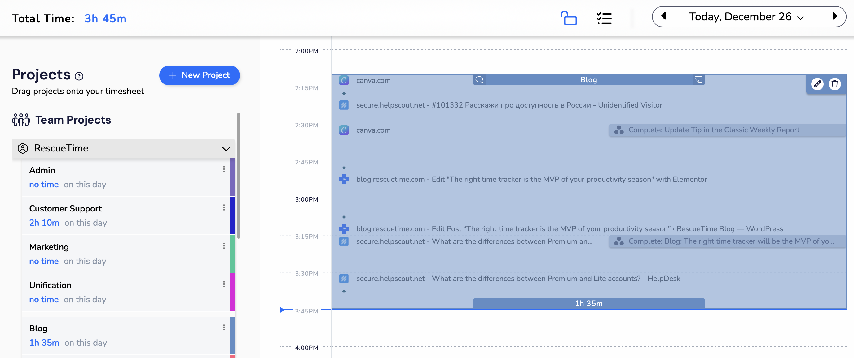 If you choose a Focus+ premium plan, you can keep track of projects, tasks, clients, and billable hours with RescueTime Timesheets.